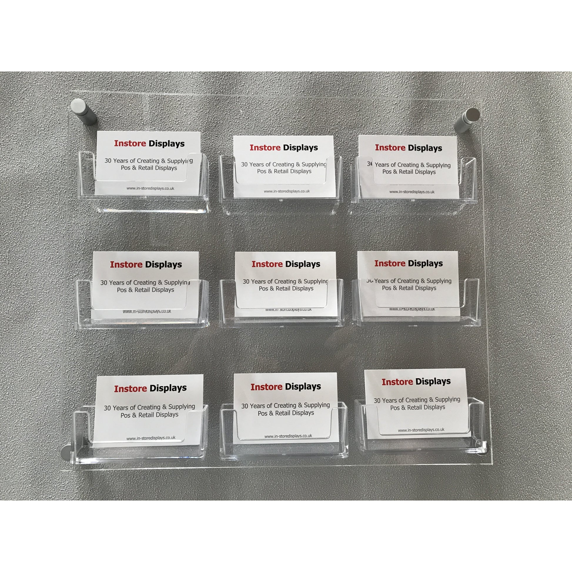 Wall mount 9 Pocket acrylic business card holder holds approx. 100 business cards per pocket. supplied with brushed aluminium stand off fitting to give a premium display. screws and raw plugs supplied.
